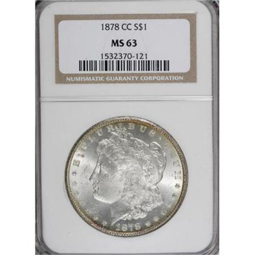 <B>1878-CC $1 MS63 NGC.</B></I> NGC Census: (3457/4721). PCGS Population (5849/6652). Mintage: 2,212,000. Numismedia Wsl. Price for NGC/PCGS coin in MS63: $308. (#7080)<BR><BR><B>Coin Engraver:</B> George T. Morgan<BR><BR><b>Shipping:</b> Coins & Currency (<a target="_blank" href="http://www.heritageauctions.com/common/shipping.php">view shipping information</a>)
