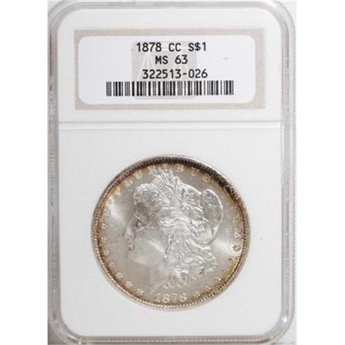 <B>1878-CC $1 MS63 NGC.</B></I> NGC Census: (3475/4725). PCGS Population (5849/6652). Mintage: 2,212,000. Numismedia Wsl. Price for NGC/PCGS coin in MS63: $308. (#7080)<BR><BR><B>Coin Engraver:</B> George T. Morgan<BR><BR><b>Shipping:</b> Coins & Currency (<a target="_blank" href="http://www.heritageauctions.com/common/shipping.php">view shipping information</a>)