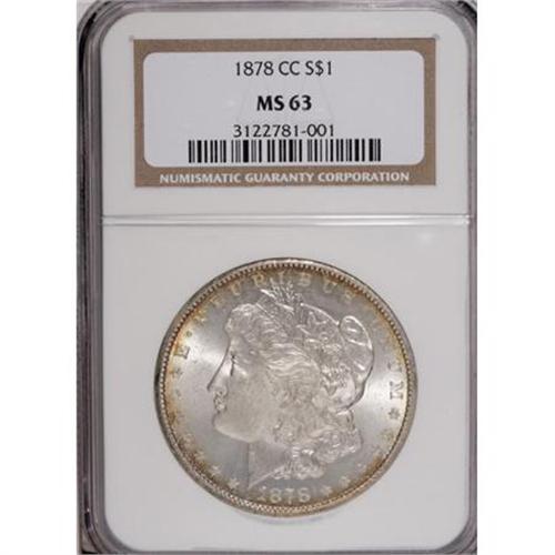 <B>1878-CC $1 MS63 NGC.</B></I> NGC Census: (3534/4796). PCGS Population (5959/6802). Mintage: 2,212,000. Numismedia Wsl. Price for NGC/PCGS coin in MS63: $300. (#7080)<BR><BR><B>Coin Engraver:</B> George T. Morgan<BR><BR><b>Shipping:</b> Coins & Currency (<a target="_blank" href="http://www.heritageauctions.com/common/shipping.php">view shipping information</a>)