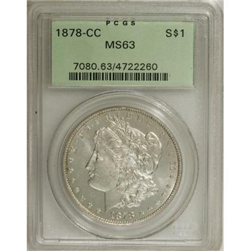 <B>1878-CC $1 MS63 PCGS.</B></I> PCGS Population (5758/6510). NGC Census: (3354/4693). Mintage: 2,212,000. Numismedia Wsl. Price for NGC/PCGS coin in MS63: $308. (#7080)<BR><BR><B>Coin Engraver:</B> George T. Morgan<BR><BR><b>Shipping:</b> Coins & Currency (<a target="_blank" href="http://www.heritageauctions.com/common/shipping.php">view shipping information</a>)