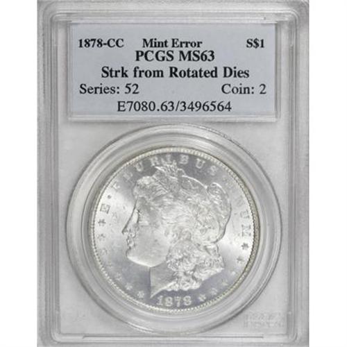 <B>1878-CC $1 Morgan Dollar--Struck from Rotated Dies--MS63 PCGS.</B></I> <BR><BR><B>Coin Engraver:</B> George T. Morgan<BR><BR><b>Shipping:</b> Coins & Currency (<a target="_blank" href="http://www.heritageauctions.com/common/shipping.php">view shipping information</a>)