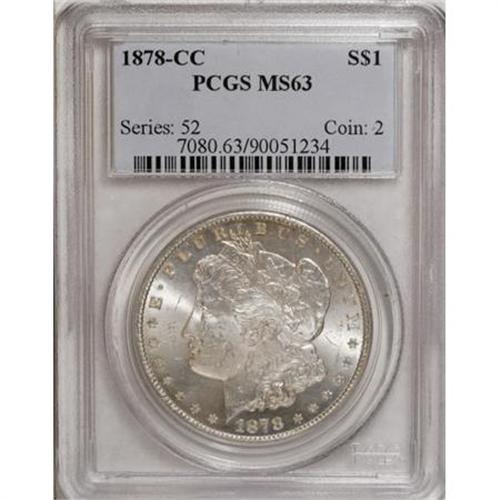 <B>1878-CC $1 MS63 PCGS.</B></I> . PCGS Population (5904/6726). NGC Census: (3512/4765). Mintage: 2,212,000. Numismedia Wsl. Price for NGC/PCGS coin in MS63: $300. (#7080)<BR><BR><B>Coin Engraver:</B> George T. Morgan<BR><BR><b>Shipping:</b> Coins & Currency (<a target="_blank" href="http://www.heritageauctions.com/common/shipping.php">view shipping information</a>)