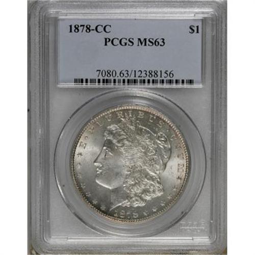 <B>1878-CC $1 MS63 PCGS.</B></I> PCGS Population (5966/6802). NGC Census: (3538/4808). Mintage: 2,212,000. Numismedia Wsl. Price for NGC/PCGS coin in MS63: $300. (#7080)<BR><BR><B>Coin Engraver:</B> George T. Morgan<BR><BR><b>Shipping:</b> Coins & Currency (<a target="_blank" href="http://www.heritageauctions.com/common/shipping.php">view shipping information</a>)