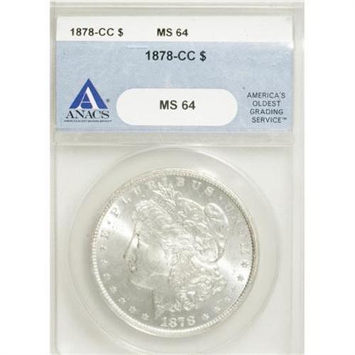 <B>1878-CC $1 MS64 ANACS.</B></I> NGC Census: (3610/1083). PCGS Population (4955/1621). Mintage: 2,212,000. Numismedia Wsl. Price for NGC/PCGS coin in MS64: $480. (#7080)<BR><BR><B>Coin Engraver:</B> George T. Morgan<BR><BR><b>Shipping:</b> Coins & Currency (<a target="_blank" href="http://www.heritageauctions.com/common/shipping.php">view shipping information</a>)