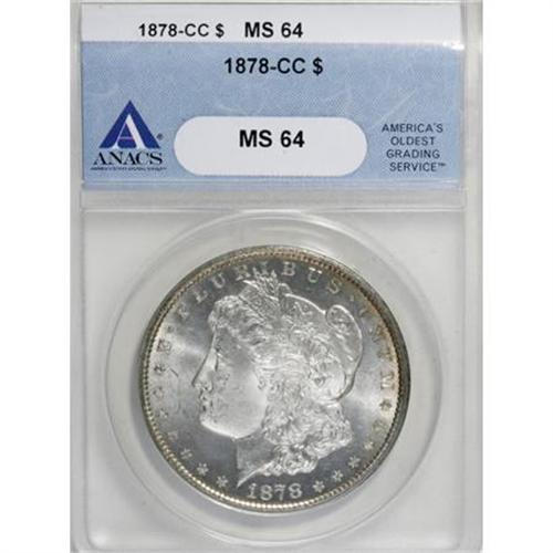 <B>1878-CC $1 MS64 ANACS.</B></I> . NGC Census: (3689/1080). PCGS Population (5076/1650). Mintage: 2,212,000. Numismedia Wsl. Price for NGC/PCGS coin in MS64: $470. (#7080)<BR><BR><B>Coin Engraver:</B> George T. Morgan<BR><BR><b>Shipping:</b> Coins & Currency (<a target="_blank" href="http://www.heritageauctions.com/common/shipping.php">view shipping information</a>)