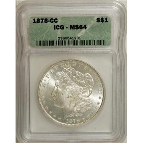 <B>1878-CC $1 MS64 ICG.</B></I> NGC Census: (3588/1071). PCGS Population (4848/1593). Mintage: 2,212,000. Numismedia Wsl. Price for NGC/PCGS coin in MS64: $480. (#7080)<BR><BR><B>Coin Engraver:</B> George T. Morgan<BR><BR><b>Shipping:</b> Coins & Currency (<a target="_blank" href="http://www.heritageauctions.com/common/shipping.php">view shipping information</a>\)