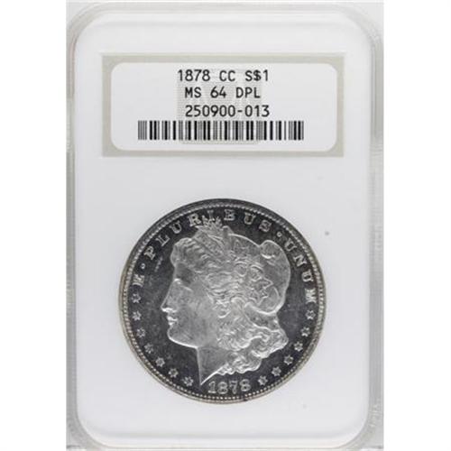 <B>1878-CC $1 MS64 Deep Mirror Prooflike NGC.</B></I> Lavender and sea-green encompass the borders, while the mirrored fields are untoned. Well struck except for the claws and the base of the wreath. The reverse is well preserved. Encapsulated in a prior generation holder.<BR><BR><b>Shipping:</b> Coins & Currency (<a target="_blank" href="http://www.heritageauctions.com/common/shipping.php">view shipping information</a>)