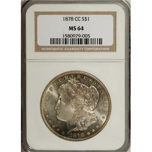 <B>1878-CC $1 MS64 NGC.</B></I> NGC Census: (3597/1078). PCGS Population (4869/1603). Mintage: 2,212,000. Numismedia Wsl. Price for NGC/PCGS coin in MS64: $480. (#7080)<BR><BR><B>Coin Engraver:</B> George T. Morgan<BR><BR><b>Shipping:</b> Coins & Currency (<a target="_blank" href="http://www.heritageauctions.com/common/shipping.php">view shipping information</a>)