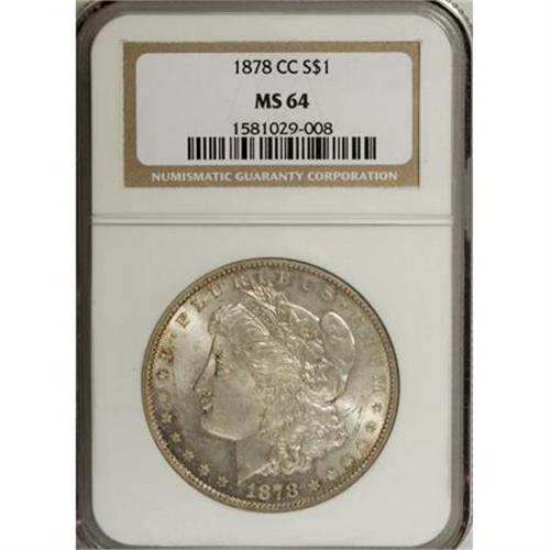 <B>1878-CC $1 MS64 NGC.</B></I> NGC Census: (3610/1083). PCGS Population (4905/1605). Mintage: 2,212,000. Numismedia Wsl. Price for NGC/PCGS coin in MS64: $480. (#7080)<BR><BR><B>Coin Engraver:</B> George T. Morgan<BR><BR><b>Shipping:</b> Coins & Currency (<a target="_blank" href="http://www.heritageauctions.com/common/shipping.php">view shipping information</a>)