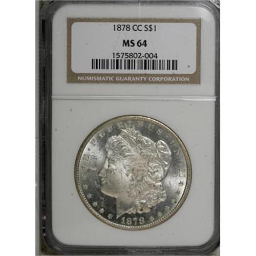 <B>1878-CC $1 MS64 NGC.</B></I> NGC Census: (3610/1083). PCGS Population (4937/1616). Mintage: 2,212,000. Numismedia Wsl. Price for NGC/PCGS coin in MS64: $480. (#7080)<BR><BR><B>Coin Engraver:</B> George T. Morgan<BR><BR><b>Shipping:</b> Coins & Currency (<a target="_blank" href="http://www.heritageauctions.com/common/shipping.php">view shipping information</a>)
