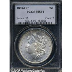 <B>1878-CC<img border='0' src='http://www.heritagecoins.com/images/star.gif' width=10 height=10>$1 MS64 PCGS.</B></I> Apricot hues adorn the margins, although the lustrous surfaces are otherwise only gently toned. A pleasing Choice representative of this inaugural Carson City Morgan Dollar issue.