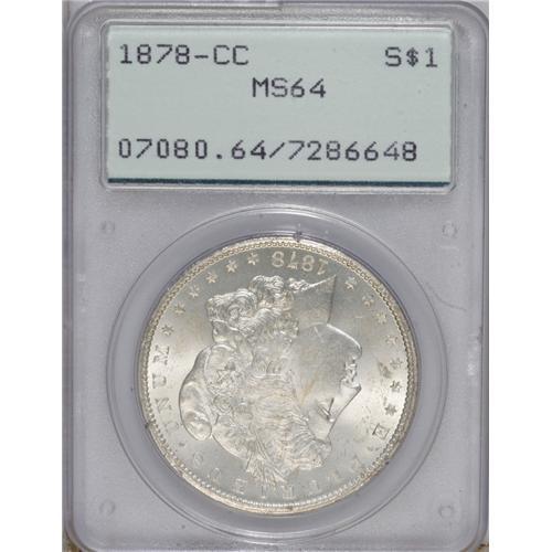 <B>1878-CC $1 MS64 PCGS.</B></I> Occasional whispers of light orange color just barely keep this near-Gem example from full brilliance. Sharply struck, a characteristic of the issue, including excellent delineation in the hair at Liberty's ear, and the eagle's breast feathers. Lustrous surfaces reveal a few grade-defining obverse marks. Housed in a first generation PCGS holder.<BR><BR><b>Shipping:</b> Coins & Currency (<a target="_blank" href="http://www.heritageauctions.com/common/shipping.php">view shipping information</a>)