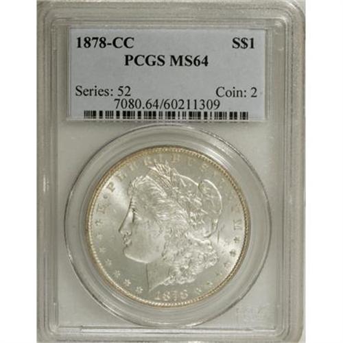 <B>1878-CC $1 MS64 PCGS.</B></I> PCGS Population (4905/1605). NGC Census: (3610/1083). Mintage: 2,212,000. Numismedia Wsl. Price for NGC/PCGS coin in MS64: $480. (#7080)<BR><BR><B>Coin Engraver:</B> George T. Morgan<BR><BR><b>Shipping:</b> Coins & Currency (<a target="_blank" href="http://www.heritageauctions.com/common/shipping.php">view shipping information</a>)