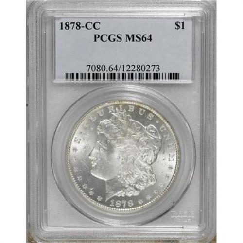 <B>1878-CC $1 MS64 PCGS.</B></I> . PCGS Population (5076/1650). NGC Census: (3689/1080). Mintage: 2,212,000. Numismedia Wsl. Price for NGC/PCGS coin in MS64: $470. (#7080)<BR><BR><B>Coin Engraver:</B> George T. Morgan<BR><BR><b>Shipping:</b> Coins & Currency (<a target="_blank" href="http://www.heritageauctions.com/common/shipping.php">view shipping information</a>)