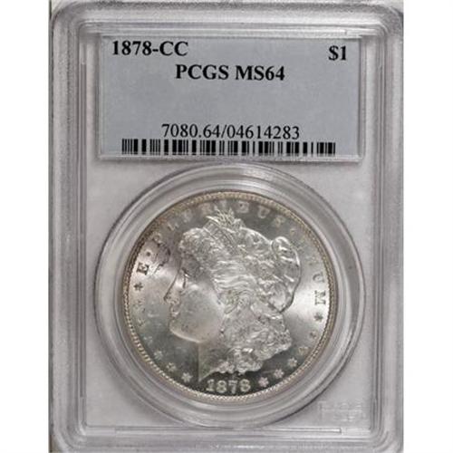 <B>1878-CC $1 MS64 PCGS.</B></I> . PCGS Population (5076/1650). NGC Census: (3684/1076). Mintage: 2,212,000. Numismedia Wsl. Price for NGC/PCGS coin in MS64: $475. (#7080)<BR><BR><B>Coin Engraver:</B> George T. Morgan<BR><BR><b>Shipping:</b> Coins & Currency (<a target="_blank" href="http://www.heritageauctions.com/common/shipping.php">view shipping information</a>)