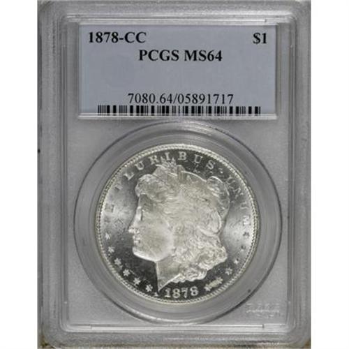 <B>1878-CC $1 MS64 PCGS.</B></I> . PCGS Population (5099/1660). NGC Census: (3690/1081). Mintage: 2,212,000. Numismedia Wsl. Price for NGC/PCGS coin in MS64: $470. (#7080)<BR><BR><B>Coin Engraver:</B> George T. Morgan<BR><BR><b>Shipping:</b> Coins & Currency (<a target="_blank" href="http://www.heritageauctions.com/common/shipping.php">view shipping information</a>)