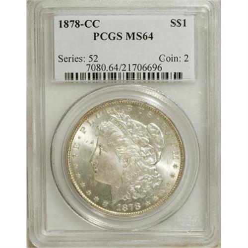 <B>1878-CC $1 MS64 PCGS.</B></I> PCGS Population (5125/1663). NGC Census: (3700/1086). Mintage: 2,212,000. Numismedia Wsl. Price for NGC/PCGS coin in MS64: $470. (#7080)<BR><BR><B>Coin Engraver:</B> George T. Morgan<BR><BR><b>Shipping:</b> Coins & Currency (<a target="_blank" href="http://www.heritageauctions.com/common/shipping.php">view shipping information</a>)