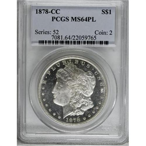 <B>1878-CC $1 MS64 Prooflike PCGS.</B></I> A fully brilliant piece with delightful mirrored fields and excellent cameo contrast. This piece will appeal to Morgan dollar collectors, Carson City Mint collectors, and first-year of issue type collectors.<BR><BR><B>Coin Engraver:</B> George T. Morgan<BR><BR><b>Shipping:</b> Coins & Currency (<a target="_blank" href="http://www.heritageauctions.com/common/shipping.php">view shipping information</a>)