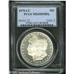 <B>1878-CC<img border='0' src='http://www.heritagecoins.com/images/star.gif' width=10 height=10>$1 MS65 Deep Mirror Prooflike PCGS.</B></I> The combination of the Carson City mintmark and Deep Mirror Prooflike fields has proved an irresistible combination for many silver dollar collectors. In Gem grade and with DMPL fields, the '78-CC is certainly a condition rarity as PCGS has only certified 30 pieces with a mere three finer (1/05). This is a completely brilliant coin that exhibits unfathomable depth of mirrored reflectivity while the devices show significant mint frost. There are no singularly mentionable abrasions on either side of this impressive coin.<BR><I>From The Dr. Volker Dube Collection.</B></I> Lot:7209