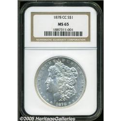 <B>1878-CC<img border='0' src='http://www.heritagecoins.com/images/star.gif' width=10 height=10>$1 MS65 NGC.</B></I> Boldly struck and highly lustrous, with bright, frosty, untoned surfaces that have a few trivial contact marks and abrasions scattered about, mainly on the obverse.