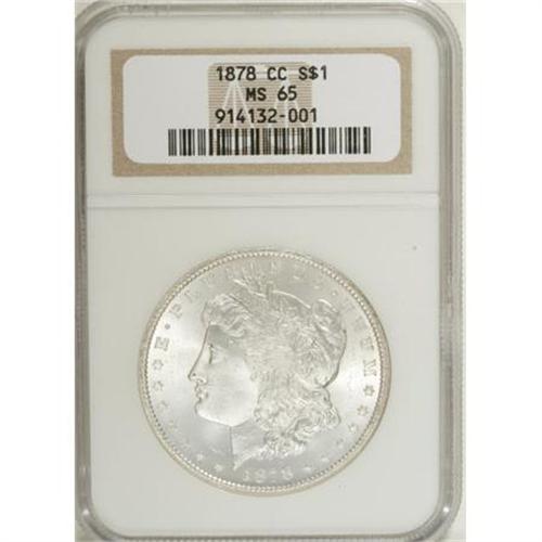 <B>1878-CC $1 MS65 NGC.</B></I> A frosty and delightful Gem from the first of many issues that would make the Carson City silver dollar a numismatic icon. Though practically brilliant at first glance, modest haze appears in the fields, which also exhibit subtle ice-blue iridescence.<BR><I>From The Silver Fox Collection.</B></I><BR><BR><b>Shipping:</b> Coins & Currency (<a target="_blank" href="http://www.heritageauctions.com/common/shipping.php">view shipping information</a>)