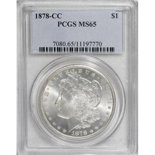 <B>1878-CC $1 MS65 PCGS.</B></I> Delicate almond-gold toning visits this lustrous and carefully preserved Gem. The strike is unimprovable except on the lower reverse denticles.<BR><BR><b>Shipping:</b> Coins & Currency (<a target="_blank" href="http://www.heritageauctions.com/common/shipping.php">view shipping information</a>)