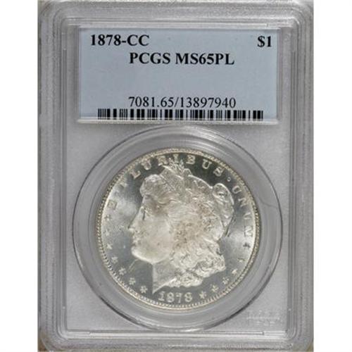 <B>1878-CC $1 MS65 Prooflike PCGS.</B></I> This borderline Deep Mirror Prooflike piece has fully brilliant mirrored surfaces with outstanding cameo contrast. The surfaces have a few tiny marks, but are virtually pristine. Only 12 finer prooflike examples have been certified by PCGS (6/07).<BR><BR><b>Shipping:</b> Coins & Currency (<a target="_blank" href="http://www.heritageauctions.com/common/shipping.php">view shipping information</a>)