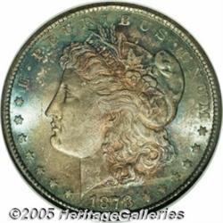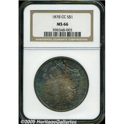 <B>1878-CC<img border='0' src='http://www.heritagecoins.com/images/star.gif' width=10 height=10>$1 MS66 NGC.</B></I> Toned on both the obverse and reverse with vibrant aqua blue and deep russet tones over Liberty. The surfaces are gorgeous, with satiny luster which dances in the fields and very few signs of handling are found. We do note a very minor vertical tick on Liberty's chin, but this is old and toned over. First year of issue for the Morgan dollar, and this series remains one of the most popular with collectors. If you appreciate toned coins, then here is one to go after for your collection. Population: 116 in 66, 4 finer (2/05).