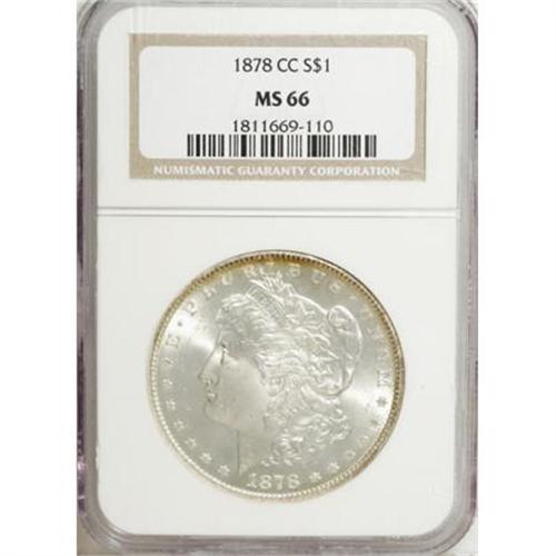 <B>1878-CC $1 MS66 NGC.</B></I> This example of the premier Carson City Morgan Dollar offering boasts the sharp details so often seen from the earlier issues from this storied mint. The lustrous fields only hint at reflectivity, with ample mint frost providing a pleasing visual effect. Bright silver surfaces are accented with a light gold tint. <BR><BR><B>Coin Engraver:</B> George T. Morgan<BR><BR><b>Shipping:</b> Coins & Currency (<a target="_blank" href="http://www.heritageauctions.com/common/shipping.php">view shipping information</a>\)