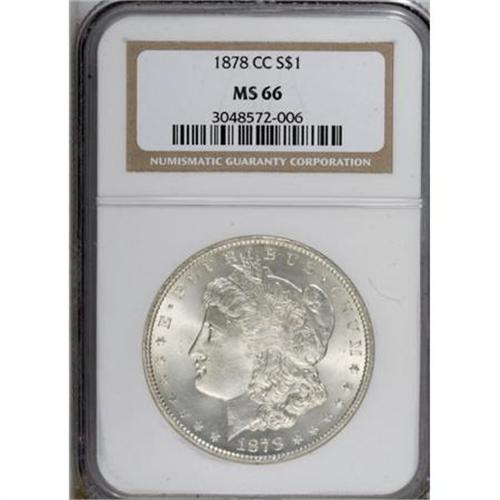 <B>1878-CC $1 MS66 NGC.</B></I> This exquisitely struck Carson City Mint specimen displays smooth silver-gray surfaces that exude glowing luster. Nicely preserved, with just one minor mark on the jaw. David Bowers (2006) estimates that a little less than one-half of the 2.212 million-piece mintage was melted under the Pittman Act.<BR><BR><B>Coin Engraver:</B> George T. Morgan<BR><BR><b>Shipping:</b> Coins & Currency (<a target="_blank" href="http://www.heritageauctions.com/common/shipping.php">view shipping information</a>)