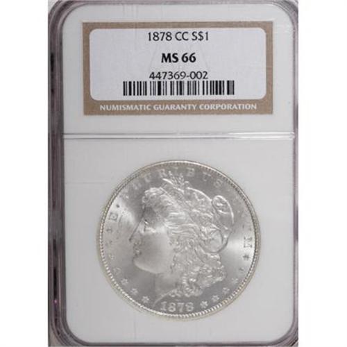 <B>1878-CC $1 MS66 NGC.</B></I> Intricately detailed, the surfaces are bone-white with excellent luster characteristics. Few abrasions are noted on either side of this impressive silver dollar. Prior to the GSA sales, the 1878-CC was the most familiar Carson City issue in Mint State. NGC has only certified only eight coins finer (3/08).<BR><BR><B>Coin Engraver:</B> George T. Morgan<BR><BR><b>Shipping:</b> Coins & Currency (<a target="_blank" href="http://www.heritageauctions.com/common/shipping.php">view shipping information</a>)