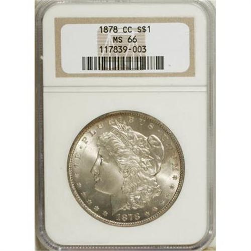 <B>1878-CC $1 MS66 NGC.</B></I> Hints of olive and tan toning enrich this lustrous and exactingly struck Premium Gem. The rims have occasional unimportant contact, but the fields and devices are remarkably unabraded. Exceptional quality for this popular first year of issue Carson City Morgan.<BR><BR><B>Coin Engraver:</B> George T. Morgan<BR><BR><b>Shipping:</b> Coins & Currency (<a target="_blank" href="http://www.heritageauctions.com/common/shipping.php">view shipping information</a>)