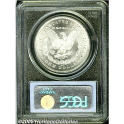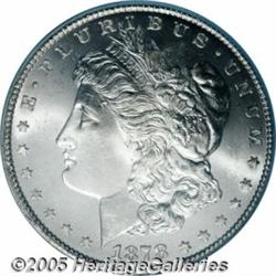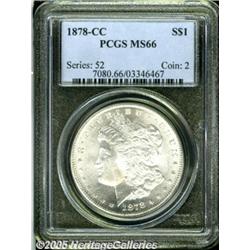 <B>1878-CC<img border='0' src='http://www.heritagecoins.com/images/star.gif' width=10 height=10>$1 MS66 PCGS.</B></I> Untoned and completely brilliant for this first year Carson City issue, with shimmering cartwheel luster in the fields and heavily frosted devices. A prized issue in this virtually unsurpassable condition. A couple of staple scratches are detected on the obverse portrait under close examination. Population: 184 in 66, 4 finer (1/05).