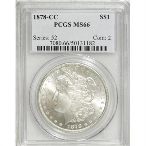 <B>1878-CC $1 MS66 PCGS.</B></I> From the hair over Liberty's ear to the feathers of the eagle, no detail is left weakly defined, thanks to a bold strike. Ample luster gives life to the clean surfaces, and Liberty's cheek is significantly cleaner than on many MS66 examples. Rarely found any finer. Population: 188 in 66, 4 finer (12/07).<BR><I>From The Motor City Collection.</B></I><BR><BR><B>Coin Engraver:</B> George T. Morgan<BR><BR><b>Shipping:</b> Coins & Currency (<a target="_blank" href="http://www.heritageauctions.com/common/shipping.php">view shipping information</a>)