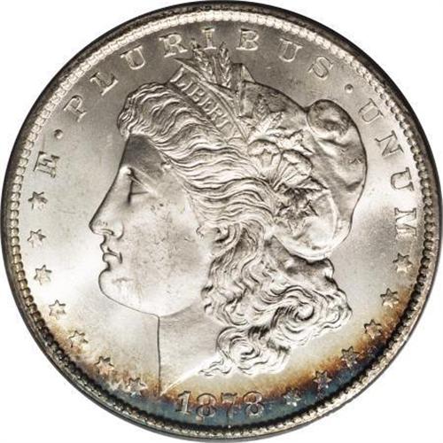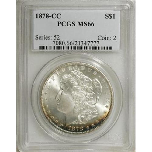 <B>1878-CC $1 MS66 PCGS.</B></I> This stunning beauty exhibits rich and fully brilliant silver luster with frosty surfaces. Aside from a thin crescent of blue, russet, and gold toning along the lower obverse border, both sides are entirely brilliant white. Ranking near the top of the population data, PCGS has only graded four coins nicer than this piece (1/08).<BR><I>From The Jimmy G. PCGS Registry Collection of Morgan Dollars with Varieties.</B></I><BR><BR><B>Coin Engraver:</B> George T. Morgan<BR><BR><b>Shipping:</b> Coins & Currency (<a target="_blank" href="http://www.heritageauctions.com/common/shipping.php">view shipping information</a>)