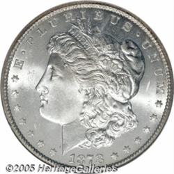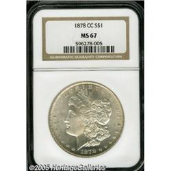 <B>1878-CC<img border='0' src='http://www.heritagecoins.com/images/star.gif' width=10 height=10>$1 MS67 NGC.</B></I> The demand for Carson City dollars is far greater than that for any other mint. The 1878-CC is the first year of issue, adding even more pressure for high grade examples of this date. The mintage was 2.2 million pieces, and while the '78-CC is relatively common in lower Uncirculated grades, those graded MS65 and finer are very elusive. Only three other pieces have been so graded by NGC with four others certified by PCGS--none are finer (2/05). This is an absolutely splendid coin. The surfaces are nearly perfect in terms of technical preservation, and the striking details are fully detailed in all areas. Thick mint frost rolls around each side of this magnificent coin. Brilliant throughout.