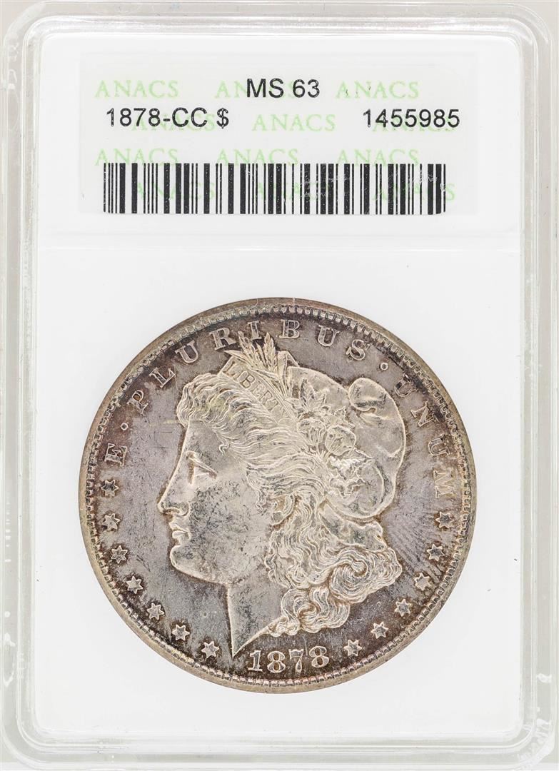 One 1878-CC $1 Morgan Silver Dollar Coin ANACS MS63. ANACS Appraised.