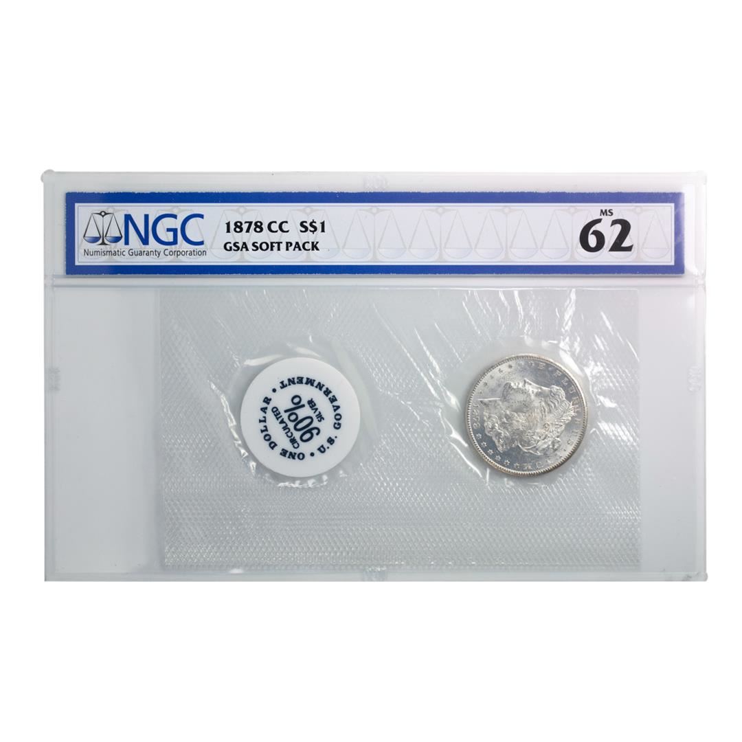 One 1878-CC $1 Morgan Silver Dollar Coin GSA Hoard Soft Pack NGC MS62. NGC Certified.