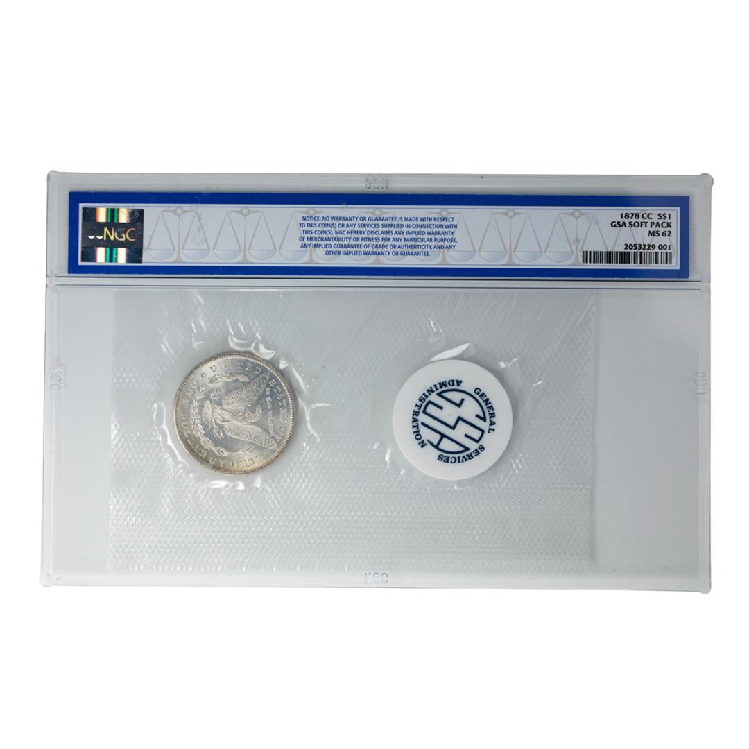 One 1878-CC $1 Morgan Silver Dollar Coin GSA Hoard Soft Pack NGC MS62. NGC Certified.