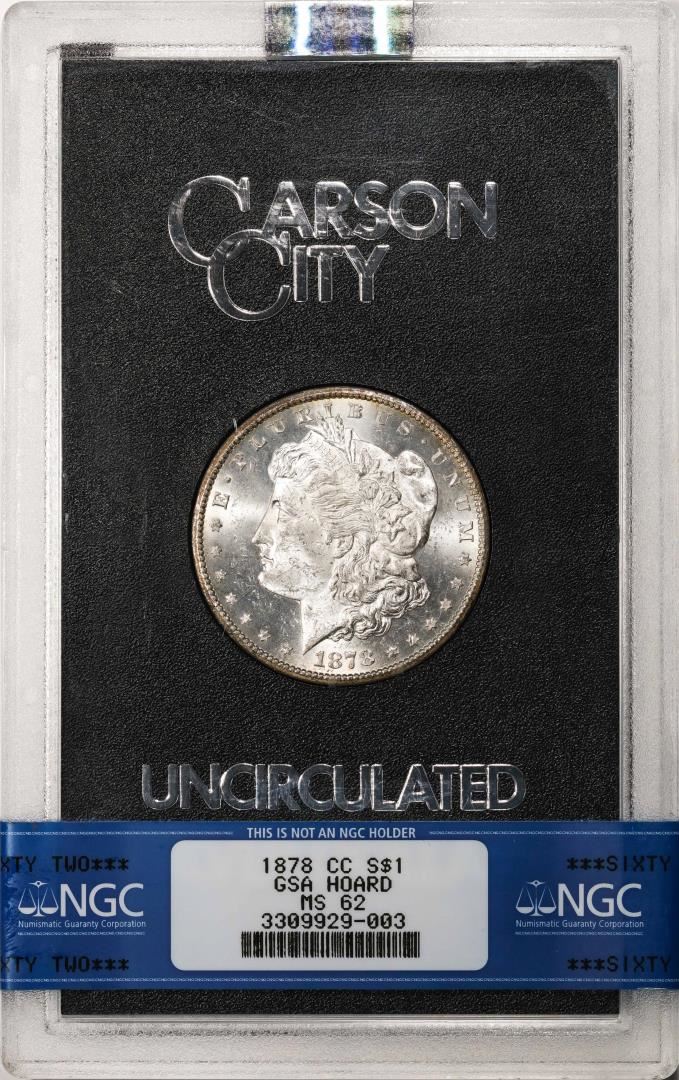 One 1878-CC $1 Morgan Silver Dollar Coin GSA Hoard Uncirculated NGC MS62 w/ Box. NGC Certified.