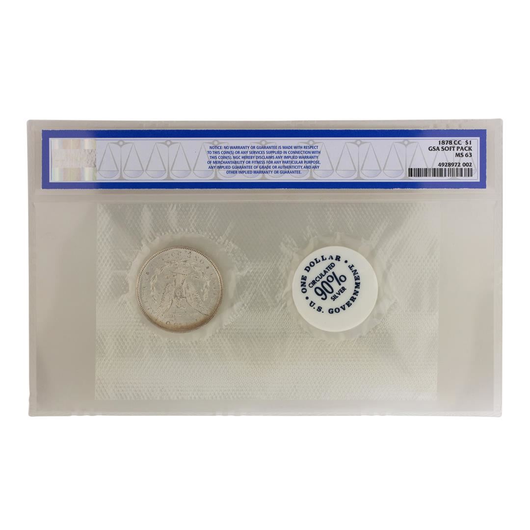 One 1878-CC $1 Morgan Silver Dollar Coin GSA Soft Pack NGC MS63. NGC Certified.