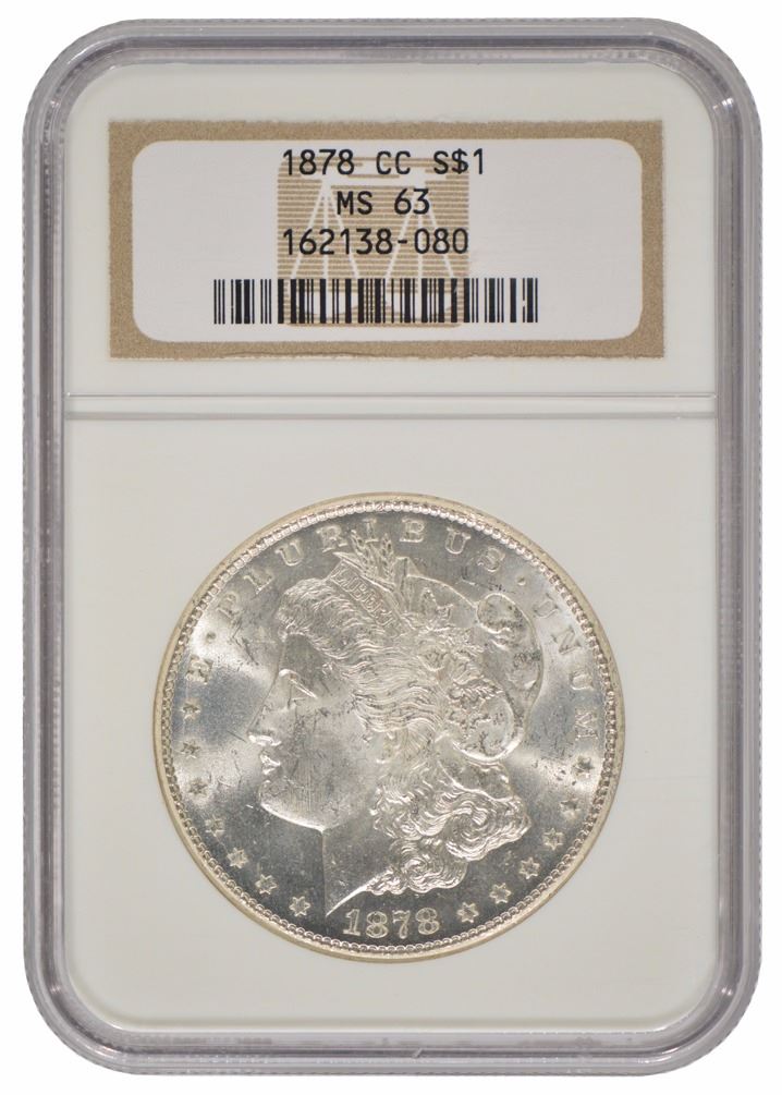 One 1878-CC $1 Morgan Silver Dollar Coin NGC MS63.