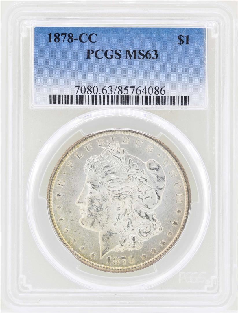 One 1878-CC $1 Morgan Silver Dollar Coin PCGS MS63. PCGS Graded.