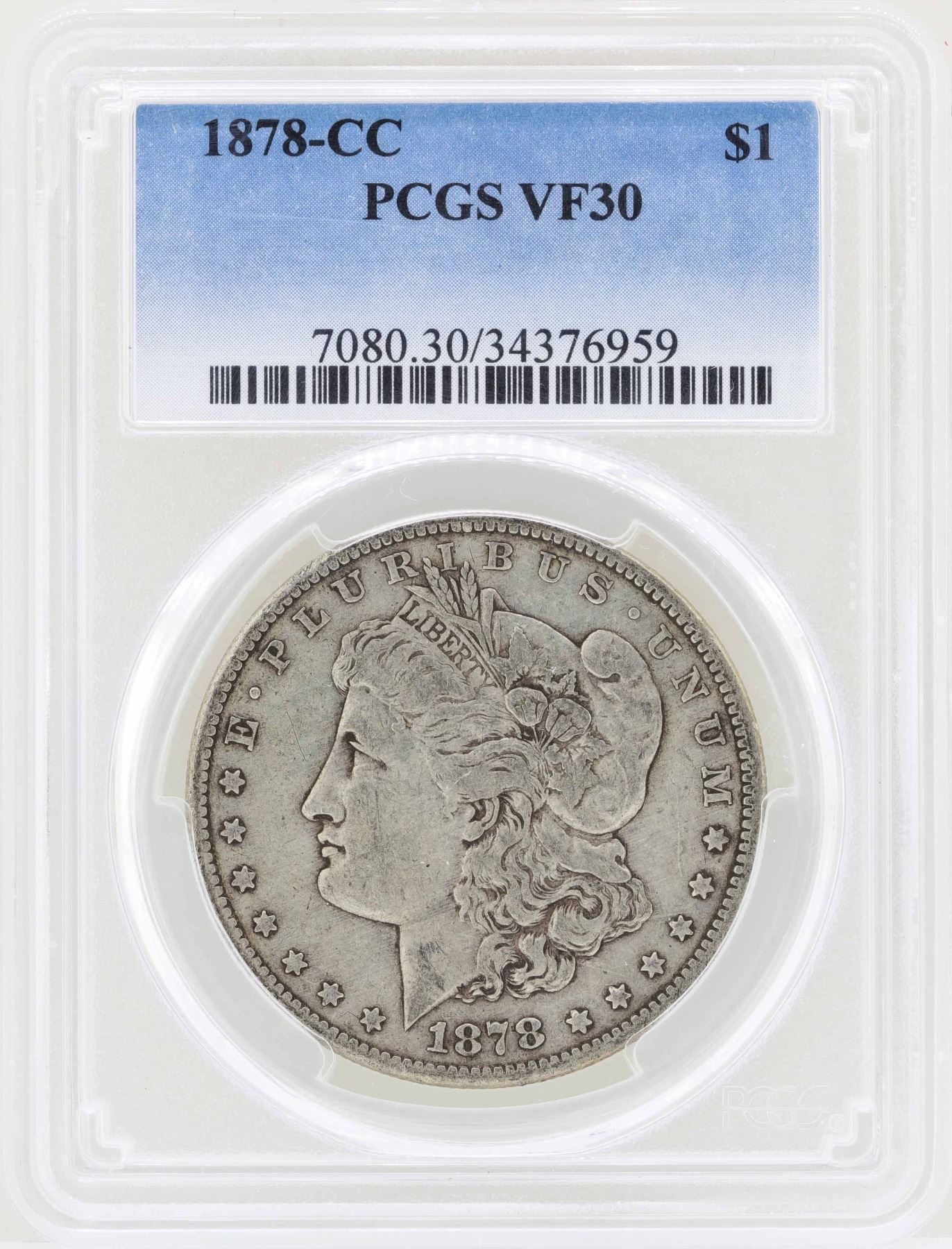 One 1878-CC $1 Morgan Silver Dollar Coin PCGS VF30.