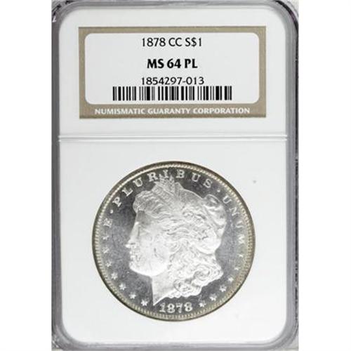 <B>1878-CC $1 MS64 Prooflike NGC.</B></I> NGC Census: (285/89). PCGS Population (327/106). Numismedia Wsl. Price for NGC/PCGS coin in MS64: $650. (#7081)<BR><BR><B>Coin Engraver:</B> George T. Morgan<BR><BR><b>Shipping:</b> Coins & Currency (<a target="_blank" href="http://www.heritageauctions.com/common/shipping.php">view shipping information</a>\)