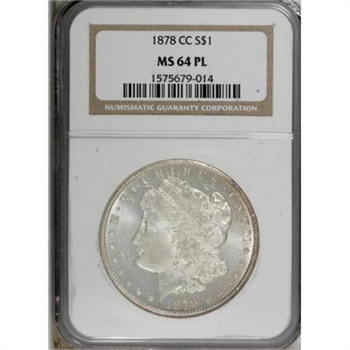 <B>1878-CC $1 MS64 Prooflike NGC.</B></I> NGC Census: (287/89). PCGS Population (329/109). Numismedia Wsl. Price for NGC/PCGS coin in MS64: $650. (#7081)<BR><BR><B>Coin Engraver:</B> George T. Morgan<BR><BR><b>Shipping:</b> Coins & Currency (<a target="_blank" href="http://www.heritageauctions.com/common/shipping.php">view shipping information</a>)