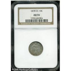<B>1878-CC 10C AU55 NGC.</B></I> Tobacco-brown and powder-blue colors illuminate the obverse margin, while the remainder of this Carson City Dime has gunmetal-gray patina. A wispy luster graze is on the upper left field of the boldly defined obverse, although no other marks are worthy of mention. Only 200,000 pieces were struck. Lot:6222
