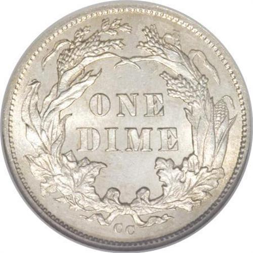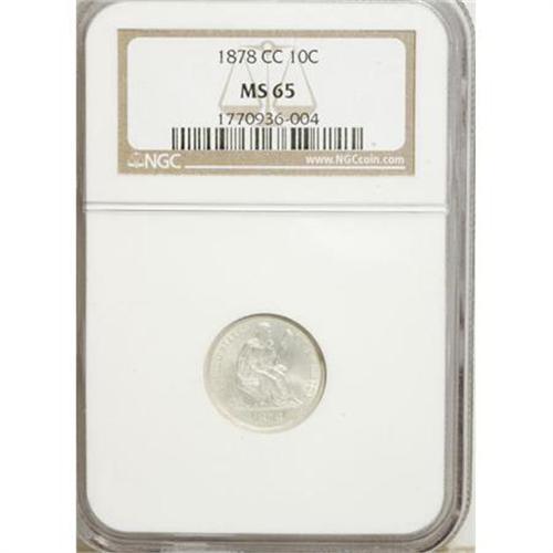 <B>1878-CC 10C MS65 NGC.</B></I> After several years of high mintages, production of dimes at Carson City fell to just 200,000 pieces in 1878. This strongly lustrous survivor, slightly satiny on the obverse, offers excellent eye appeal with hints of gold and pink at the margins of the otherwise silver-gray surfaces. Well struck and delightful. Census: 8 in 65, 11 finer (10/07).<BR><BR><B>Coin Engraver:</B> Christian Gobrecht<BR><BR><b>Shipping:</b> Coins & Currency (<a target="_blank" href="http://www.heritageauctions.com/common/shipping.php">view shipping information</a>)