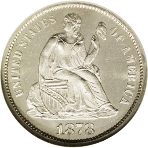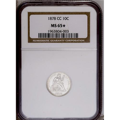 <B>1878-CC<10C> MS65 <img border='0' src='http://www.heritagecoins.com/images/star.gif' width=10 height=10> NGC.</B></I> A beautiful example of this important Carson City issue. From a drastically reduced mintage of 200,000, this lovely Gem is fully untoned with clean surfaces illuminated by intense mint frost on both sides. A few faint, raised die lines and spindly die cracks are noted, but the singular post-strike disturbance is a minor abrasion in the upper right obverse field. The exceptional eye appeal of this example is acknowledged by NGC with their coveted "Star" designation.