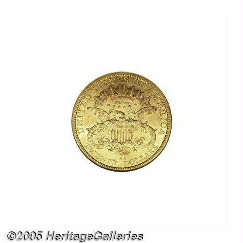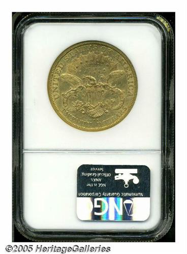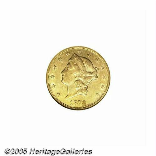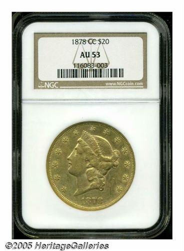 <B>1878-CC<$20> AU53 NGC.</B></I> The '78-CC is one of the more elusive Carson City Twenties, struck from a mintage of only 13,180 coins. This attractive example displays peach-gold patina with faint greenish accents, and traces of luster in the protected areas. The design elements are well impressed, and just a few minute marks are scattered about. There is a prominent die scratch at the back of Liberty's neck which is diagnostic to the issue. A noteworthy offering for the serious Carson City gold collector.
